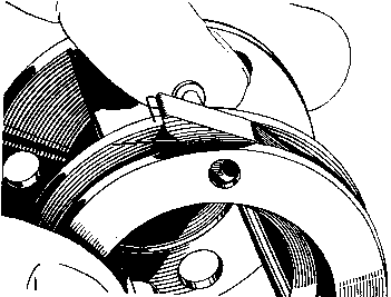 Push a pawl pin through the hole in the inner flange and, with the thumb the left hand over the pin head, hold it in contact with the side of the pawl. With the right hand take the foot of the pawl spring between thumb and forefinger and thread the straight leg under the pawl pin from the rear and pull it forward until the loop of the spring encircles the pawl pin.